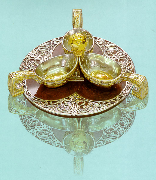 Сувенир "Русская традиция". Серебро, золото, демантоиды, рубины, уральская яшма.