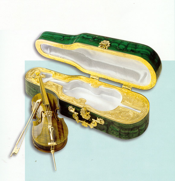 Сувенир "Виолончель". Золото, тигровый глаз, бриллианты, малахит, белый атлас.
