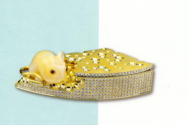 Шкатулка "Мышь на кусочке сыра". Золото, бриллианты, халцедон.